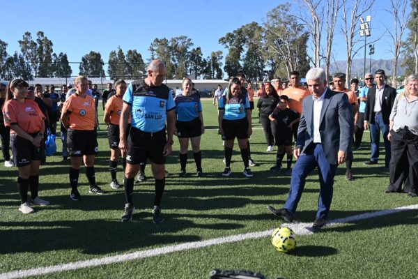 El Gobernador arribó a la cancha N°4 del complejo, donde saludó a los representantes de las dependencias ministeriales y puso a rodar la pelota para dar inicio a la competencia de la disciplina de fútbol, que hoy se desarrolló en sus tres modalidades.
