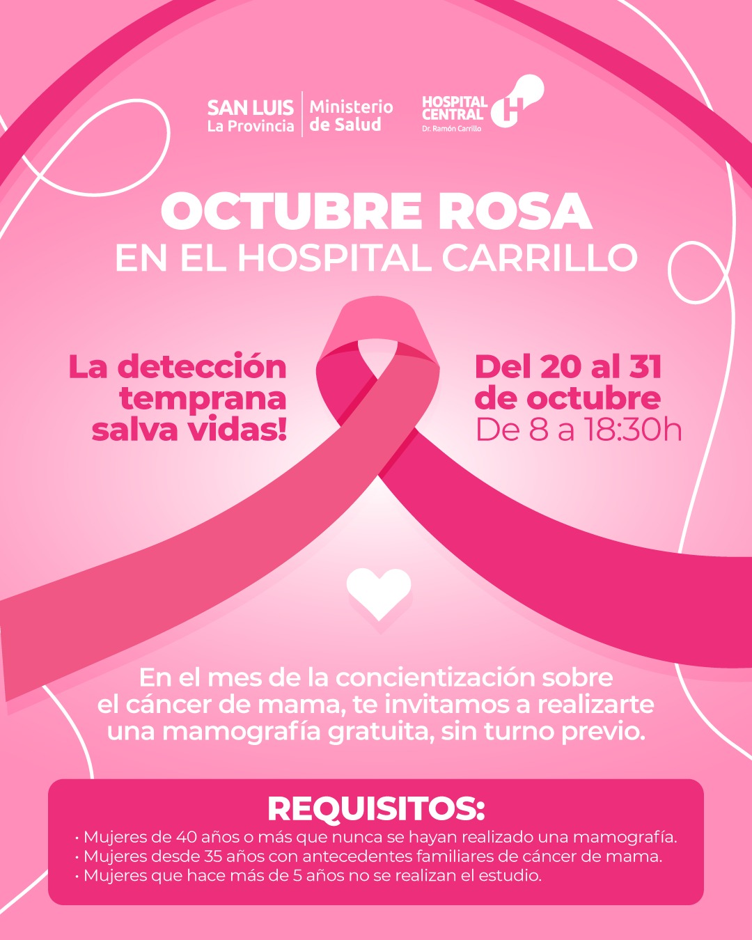 El sistema público de salud, a través del Hospital Central ‘Dr. Ramón Carrillo’, realiza una importante campaña de mamografías gratuitas y sin turno previo en el marco de Octubre Rosa, mes dedicado a la concientización sobre el cáncer de mama.