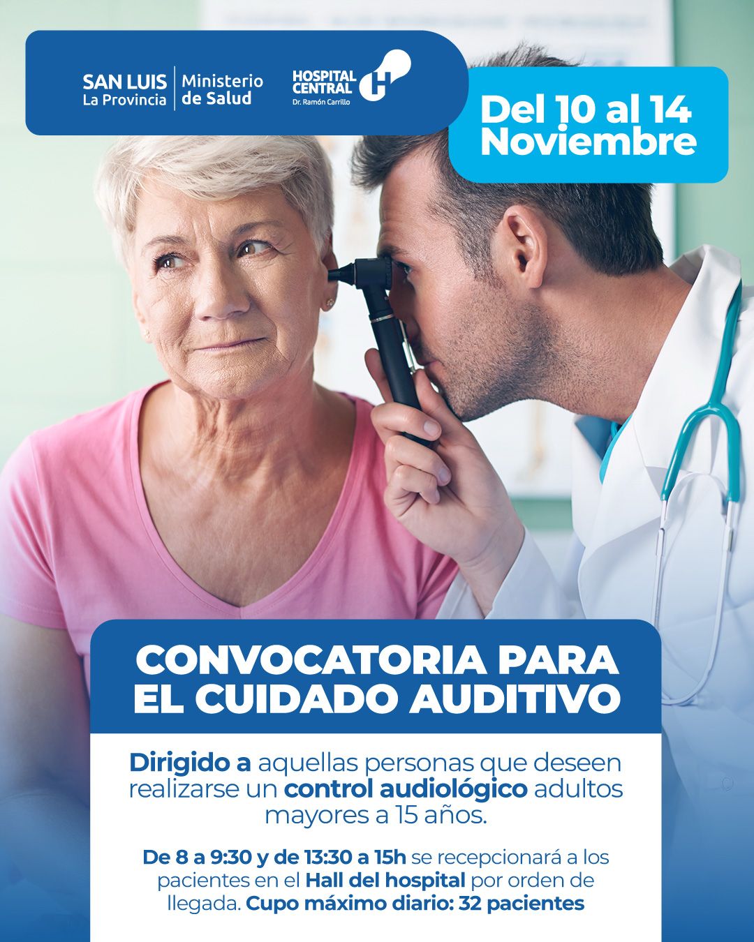 A través del Servicio de Fonoaudiología, el Hospital Central ‘Dr. Ramón Carrillo’ invita a la comunidad a participar de unas jornadas especiales de estudios para detección de patologías y control auditivo, que se llevarán a cabo del 10 al 14 de noviembre en este centro médico.