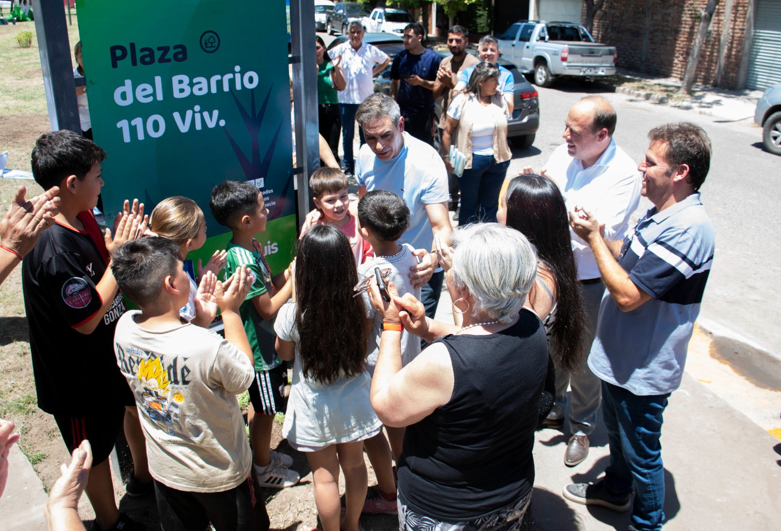 Con una inversión superior a los $40 millones, este miércoles se inauguró la renovación integral de la plaza del barrio 110 Viviendas, ubicada en la zona sur de la ciudad, en las calles Gervasio Escudero y Juan Molina. La obra se realizó dentro del Plan ‘Volvé a tu plaza’, impulsado por la comuna sanluiseña.