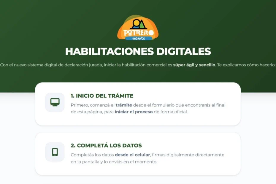 1. Inicio del trámite: ingresar a www.potreroencanta.com/habilitaciones y comenzar el trámite de forma oficial desde la web.
