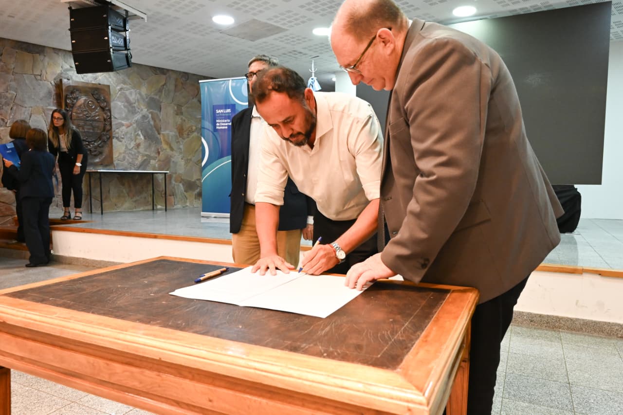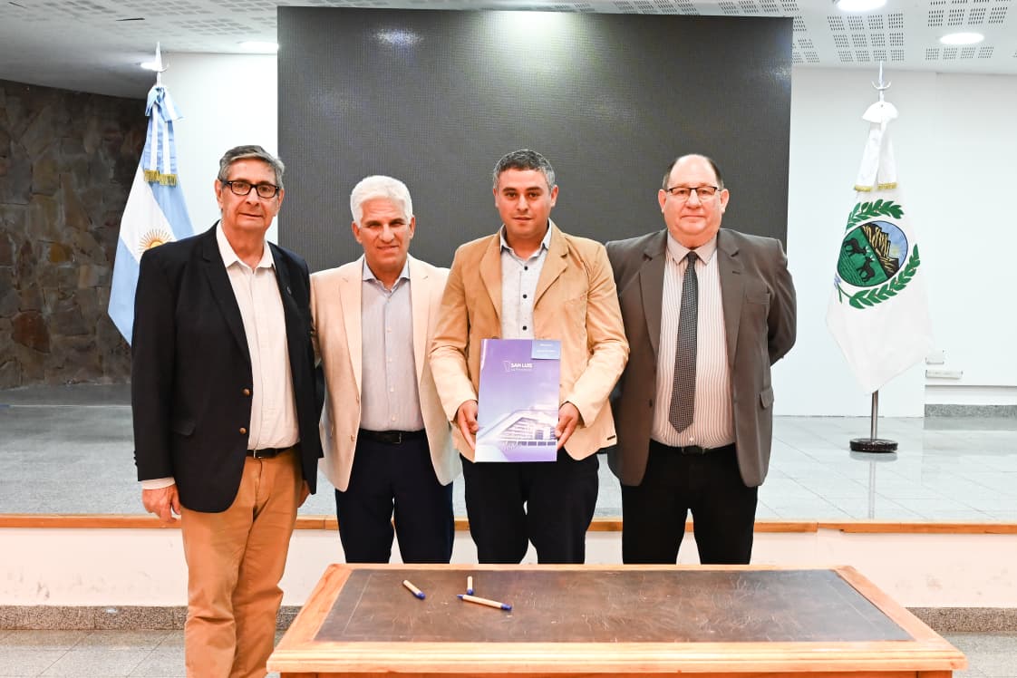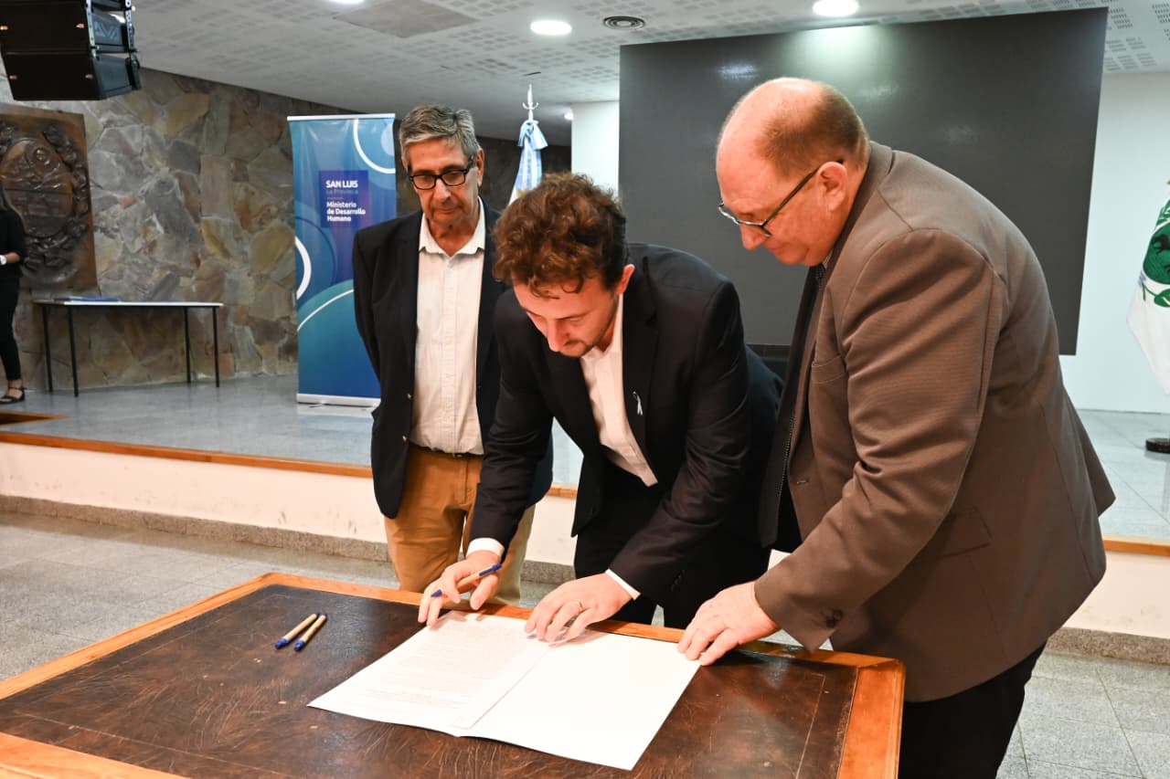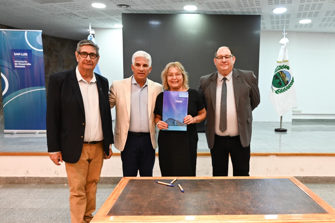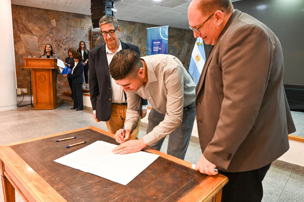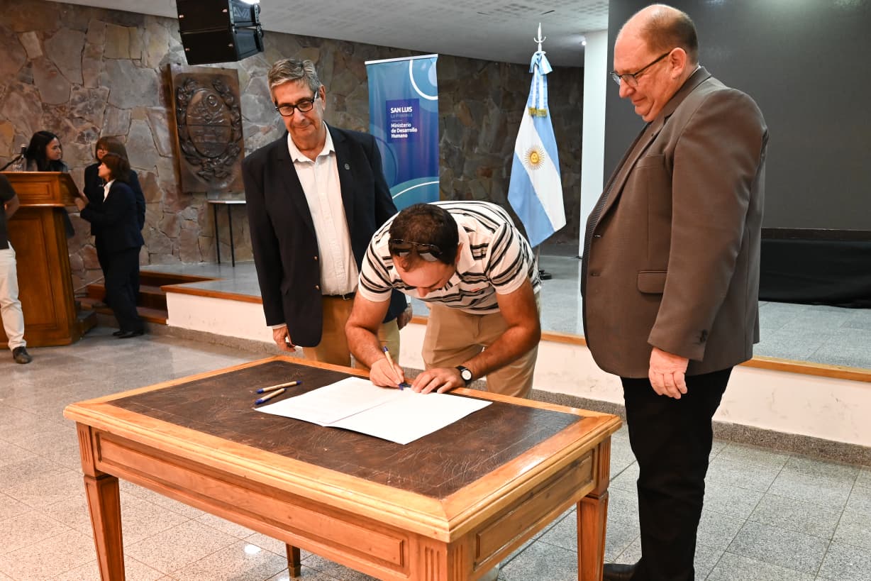 Firmaron los intendentes de Anchorena, Héctor Baigorria (5 viviendas); Bagual, Marcelo Ulloa (4); Fortuna, Diego Lucero (5); Navia, Osvaldo Olivera (1); Unión, Damián Vigil (16); Carpintería, Gastón Herrera (16); Concarán, Marcelo Gil Piccinini (20); Cortaderas, Macarena Benítez (16); La Punilla, Patricia Dubini (1); Los Molles, Marcelo Sánchez (10); Papagayos, José Gauna (6); Santa Rosa del Conlara, Miguel Postiguillo (20); Villa del Carmen, Matías Raboni (5); Villa Larca, Mateo Vilchez (10); Fraga, Gastón Argenio (10); San José del Morro, Elián Barroso (1); Naschel, Valeria Kuhn (16); Renca, Luis Altamirano (6); San Pablo, Silvia de la Serna (3); Las Chacras, Sandra Altamirano (6); La Vertiente, Marcelo Alcaraz (3); Lafinur, Gladys Cornejo (10); Leandro Alem, Eduardo Cabello (6); Luján, Mario Romero (16); Talita, Karina Maidana (4); La Calera, Diego Lorenzetti (6); La Carolina, Jorge Villegas (6); Los Manantiales, Carolina Salinas (4); Nogolí, Ramón Funes (10); Potrero de los Funes, Ignacio Olagaray (16); San Gerónimo, Norma Velásquez (5); Villa de la Quebrada, Rosa Calderón (10); Alto Pencoso, Alberto Olguín (4); Balde, Gladys Páez Sánchez (6); Beazley, Javier Díaz (10); Desaguadero, Sergio González (4) y Zanjitas, Rosendo Videla (6).