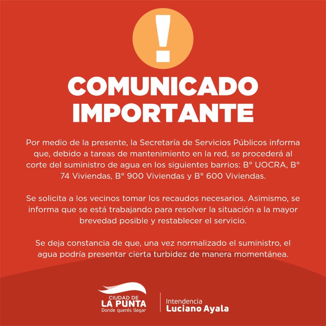 La municipalidad de La Punta informó que este viernes se interrumpira el suministro de agua a cuatro barrios de la localidad. La medida comprende a los barrios UOCRA, 74 Viviendas, 900 Viviendas y 600 Viviendas. Desde el área indicaron que el corte será temporal y responde a labores técnicas necesarias para optimizar el funcionamiento del servicio.