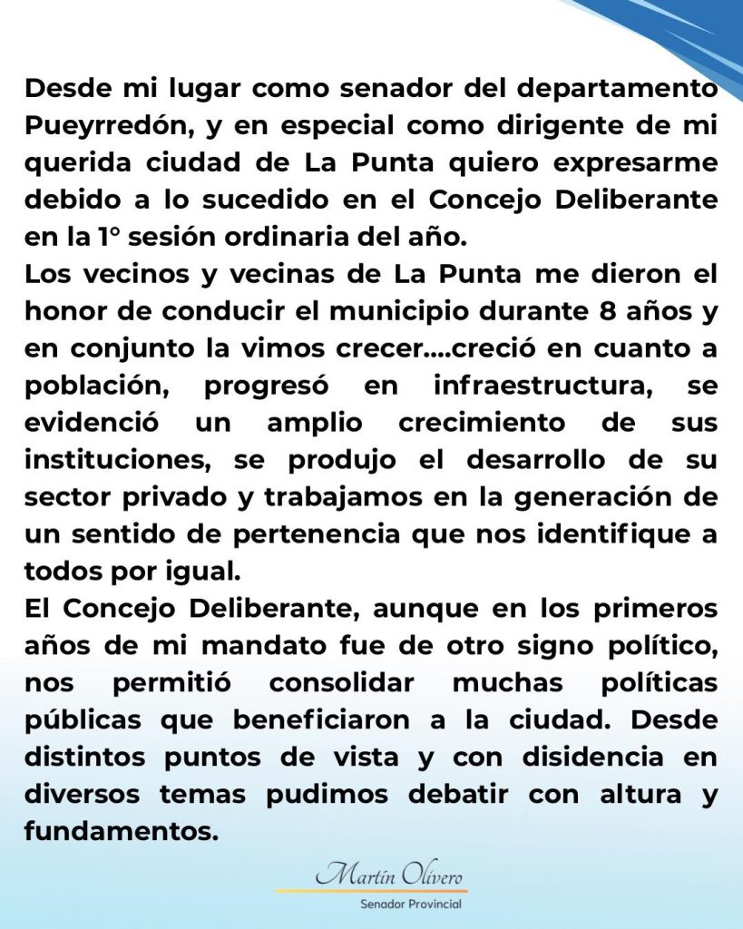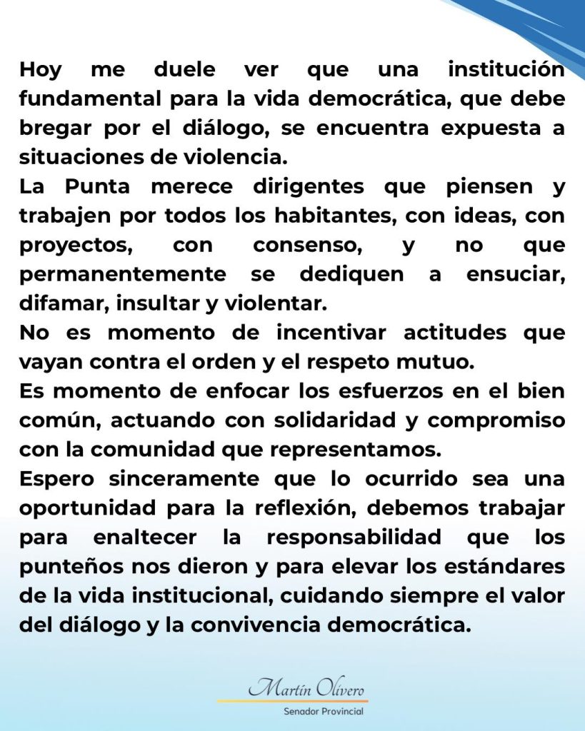 En un mensaje emitido a tráves de redes sociales, el ex intendente y senador Martín Olivero repudió el episodio que se protagonizó la semana anterior en el marco de la 1° Sesión Ordinaria del Concejo Deliberante de La Punta.