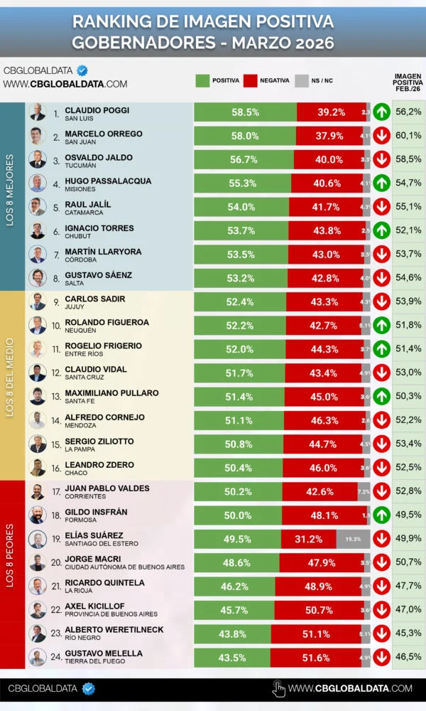 El reporte que toma opiniones de ciudadanos de todo el país también permitió observar la evolución reciente del ranking. En febrero, Claudio Poggi ya se ubicaba entre los tres gobernadores con mejor opinión pública del país. En aquella medición, el primer puesto había sido para Orrego con un 60,1% de imagen positiva, seguido por Jaldo con 58,5%, mientras que el mandatario puntano se posicionó tercero con 56,2%.