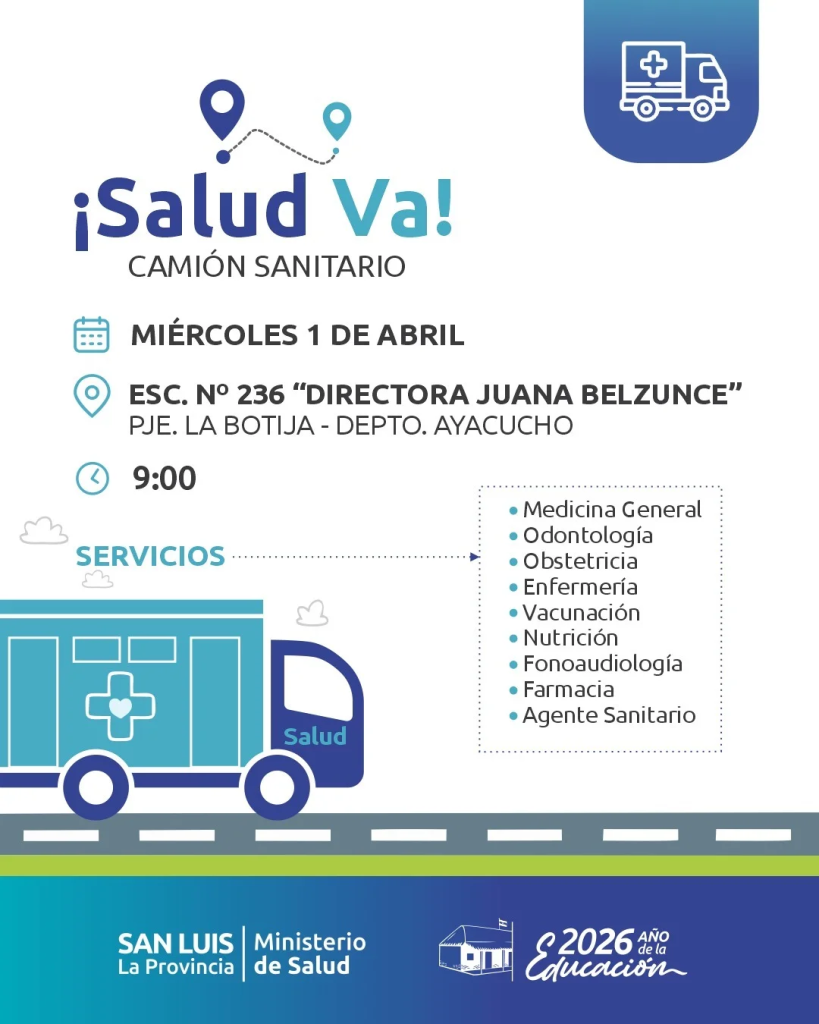 Como parte de la iniciativa llamada Salud Va, un equipo de profesionales de la salud, conformado por médicos generalistas, obstetras, psicólogos, farmacéuticos, fonoaudiólogos, odontólogos, enfermeros, nutricionistas y agentes sanitarios, visitará este miércoles desde las 9 el paraje La Botija, en el departamento Ayacucho. El camión sanitario estará específicamente en la escuela N° 236 “Directora Juan Belzunce”