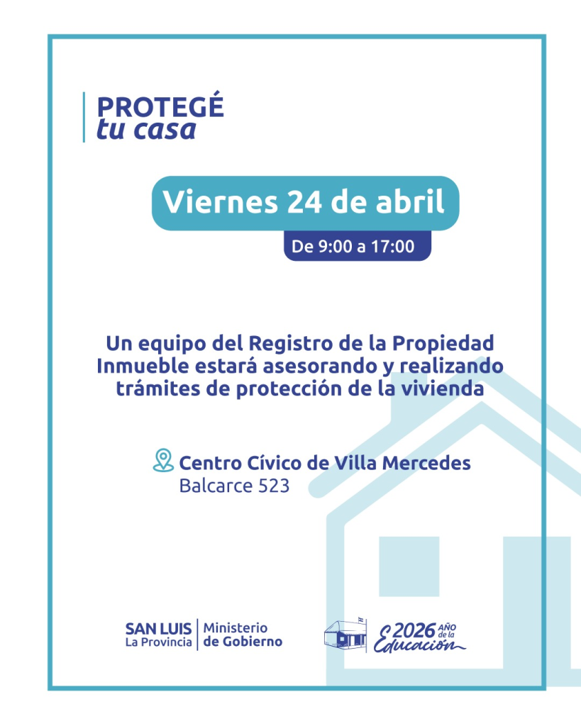 Este viernes se desarrollará en Villa Mercedes una jornada informativa y operativa sobre el programa ‘Protegé tu Casa’, destinada a difundir sus alcances y facilitar el acceso al trámite de protección de la vivienda.